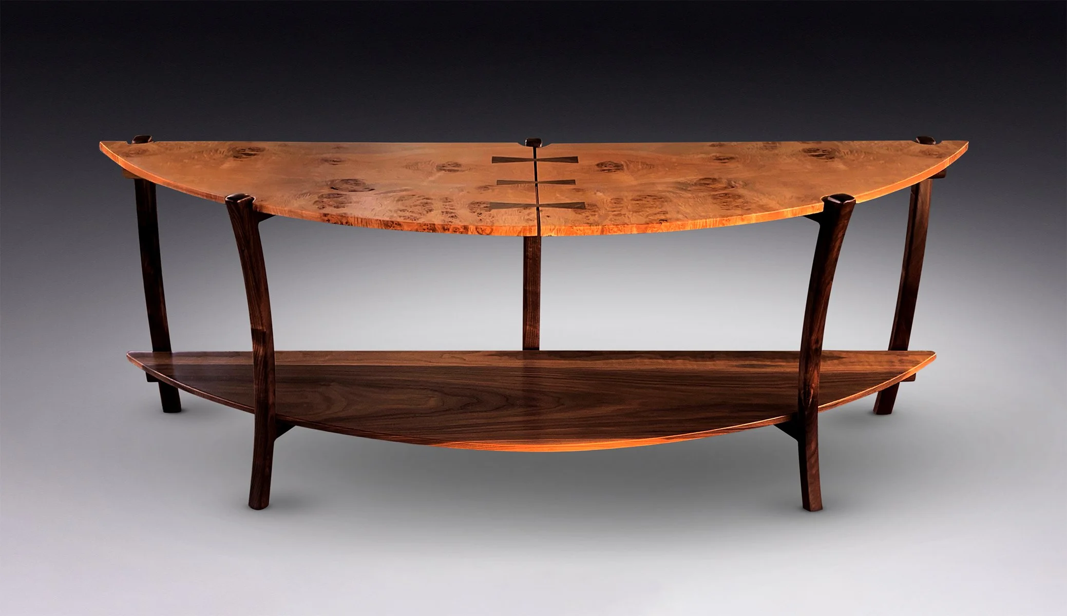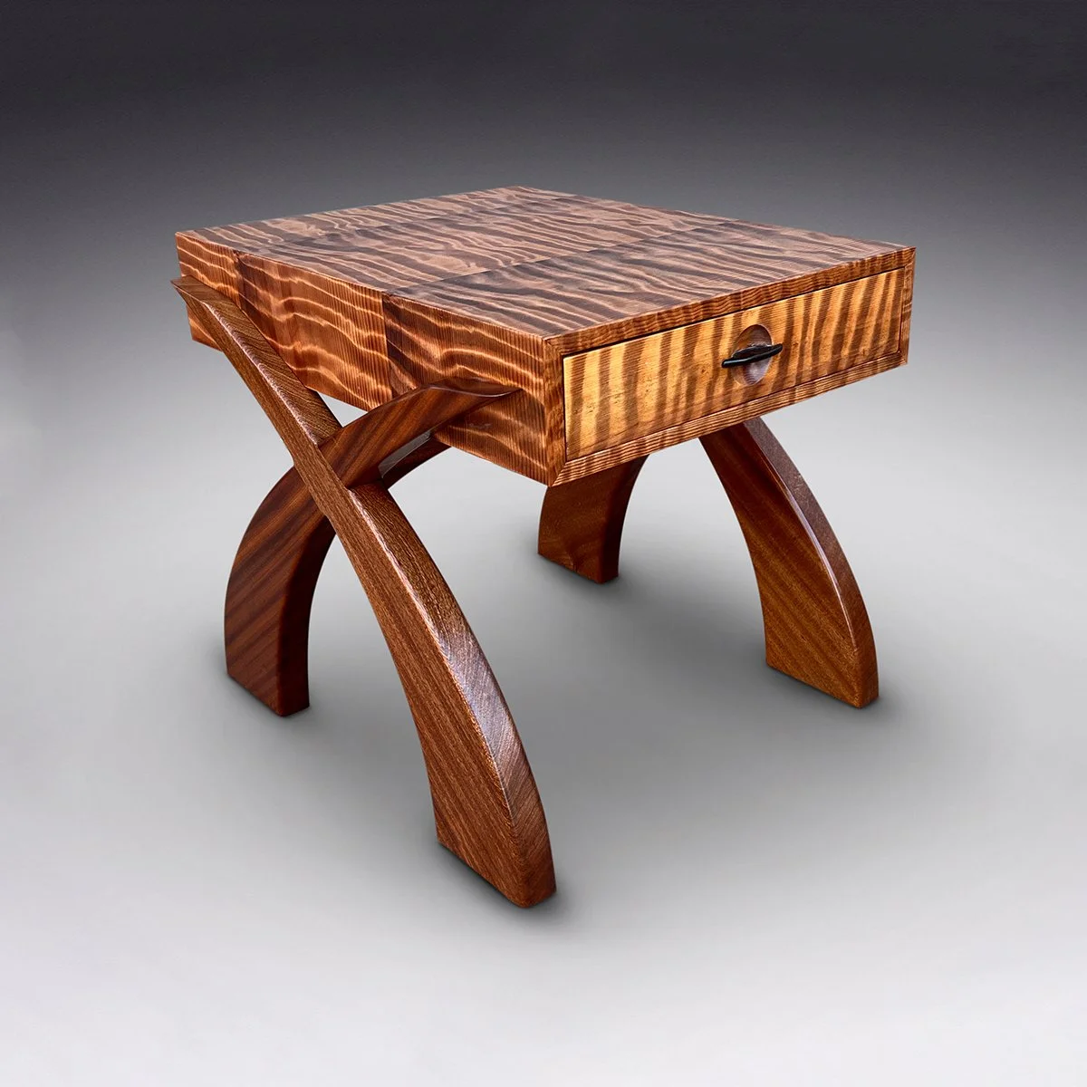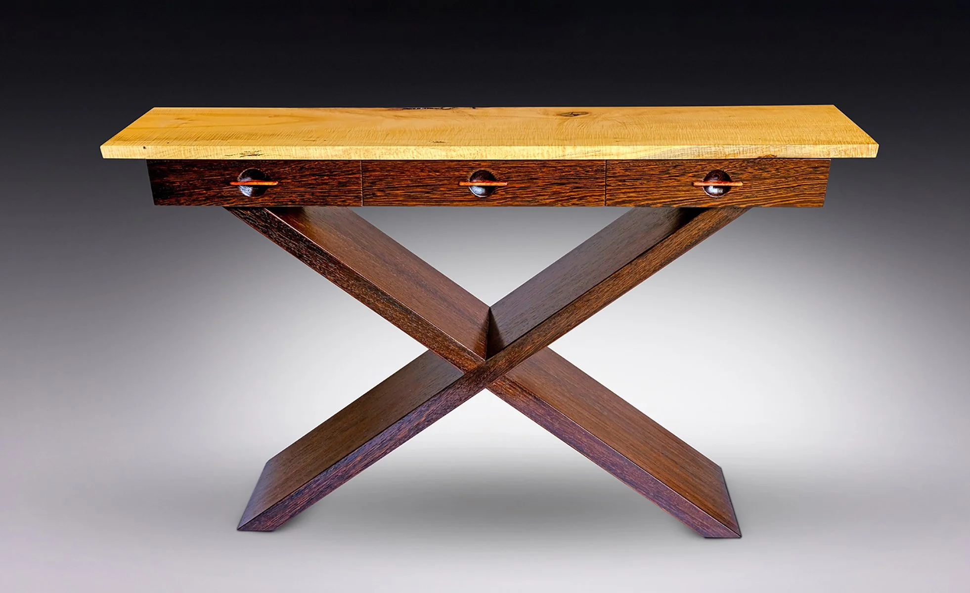 X Table, Curly Maple with Redwood Burl and Wenge
